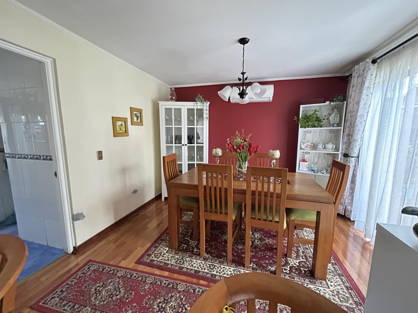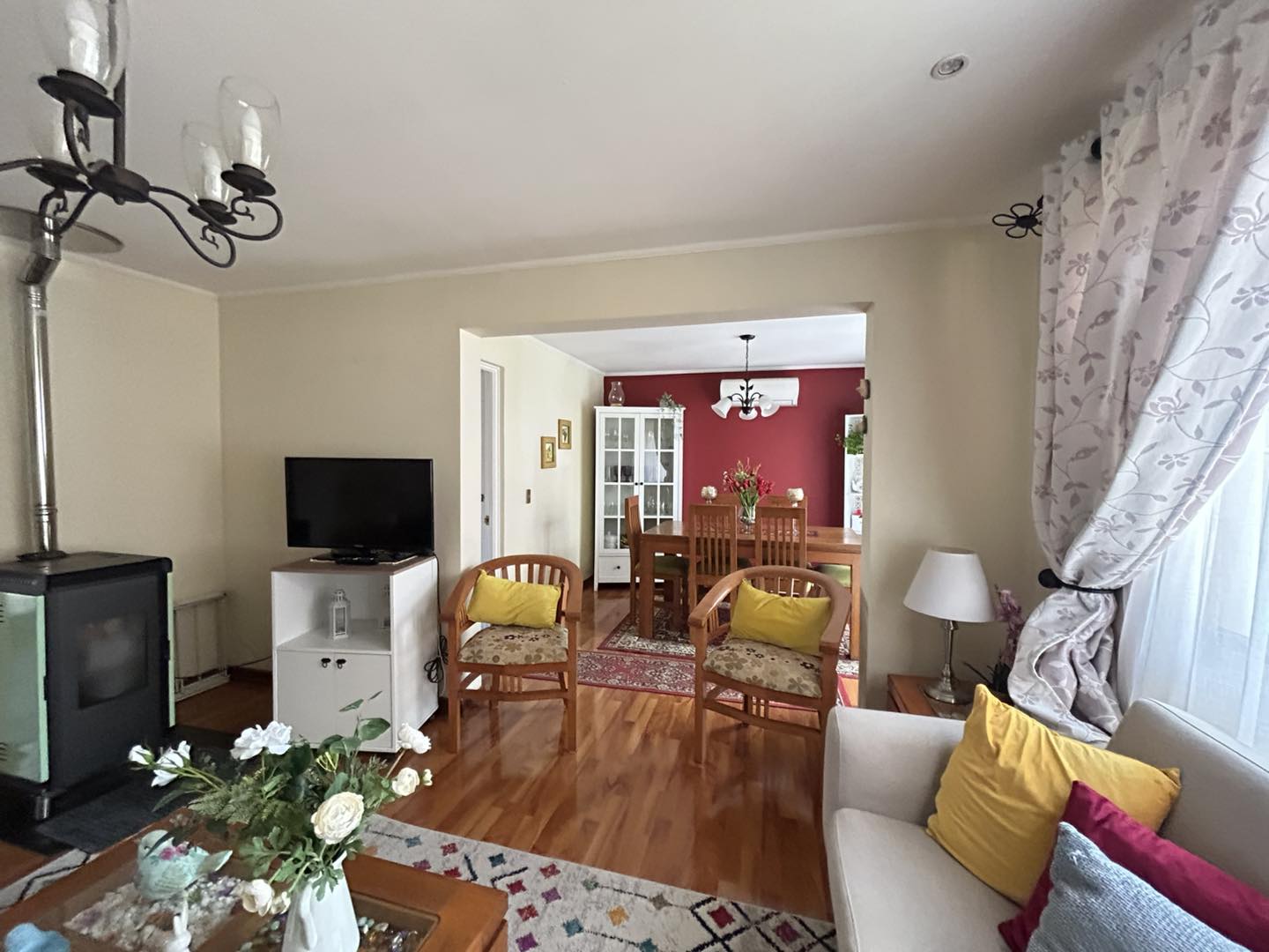 Cuenta con 3 dormitorios (dos de ellos con piso flotante, otro alfombrado, y todos con clóset), 3 baños, 1 sala de estar con piso flotante, amplia cocina amoblada y equipada, logia, living, comedor con calefacción aire acondicionado, piscina, pequeño cuarto, entrada de vehículos.